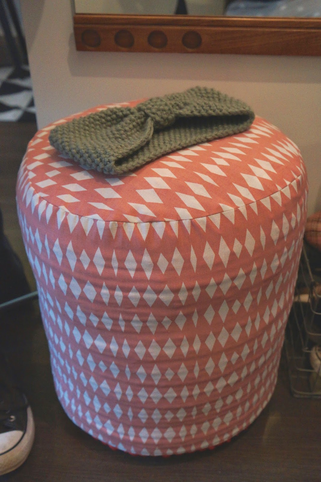 Vanha virkattu rahi sai myös uuden päällisen. Löysin Ruoholahden Kodin 1:sen loppuunmyynnin viimeisinä päivinä vielä todella edullisesti kankaita. 3 metriä kangasta maksoi vain 5 euroa.